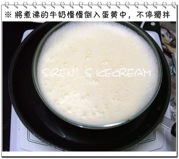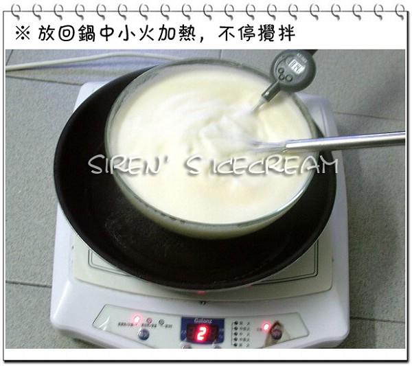 3、将混和物连盆放到锅里,隔水小火加热,并不停搅拌。有两种办法判断蛋奶糊是否完成:电子温度计测得温度为85度即可,将盆放入冰水中使之停止加热;或用汤匙伸进混合物中,如粘附的酱汁没有滴落,用手指划过勺背留下一条清晰的沟,则已煮好。 4、加入果肉。应选择浆果类的水果,制成的果泥要浓稠,不能稀释蛋奶糊。 5、鲜奶油打至六分发,与蛋奶糊混和均匀,放入冰箱冷冻。隔40分钟取出搅拌一次,搅拌4、5次,使冰激凌质地蓬松。