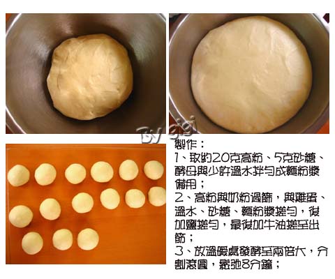 3、放溫暖處發酵至兩倍大,分割滾圓,鬆弛8分鐘; 4、包入餡料,放溫暖處進行第二次發酵,發酵完畢後表面掃蛋液,撒上馬蘇裏拉芝士, 進烤箱(先預熱200度)烤約15分鐘即可。