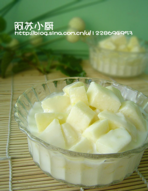 过程:苹果1个,洗净,去皮,切成小块,酸奶1盒,教在切好的苹果上,拌!