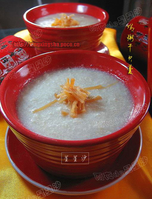 漂亮吧~~呵呵!! 做法也很简单, 只是用鸡脯肉切碎加水打成茸,加热成熟后,勾芡,淋上少许鸡油撒上干贝[或肉松]就OK 了. 粥全是用鸡肉打碎出来的精华,既鲜美又爽口, 淋上鸡油非常的香哦