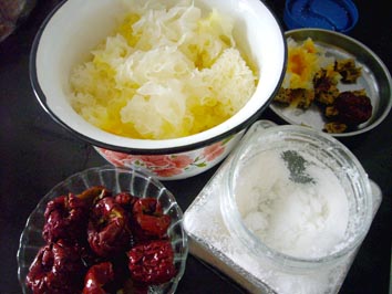 发好的银耳去根洗干净、红枣去核、糖最好是冰糖(没找到)