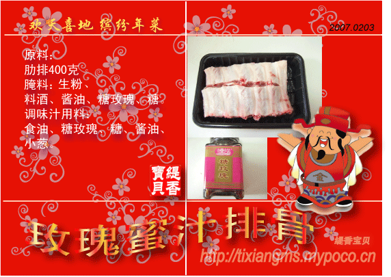 原以为从今天开始就可以在家做做菜放大假了,可是明天后天都要去值班,我再哭! 好久好久米有做肉肉的菜了,过年了,还是要有点肉的,不然就不够完美。 偏甜品味的肉类菜肴是比较受欢迎的,这是我多年在外FB得出的经验。比如丁香排骨、叉烧、樱桃肉、咕老肉等等。这些菜在餐桌上都是会被消灭光光的。用糖玫瑰来做排骨,味道也是一级的赞。 用香香的糖玫瑰腌渍过的排骨,也有了淡淡的玫瑰气息。 也许这一道菜,更适合在情人节来享用。 [1] [2] [3] [4] [5] 第1页、共5页