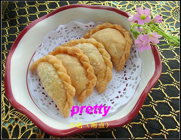 馅料材料:花生打碎、椰茸、芝麻(炒香)、幼沙糖 先将所有馅料材料混匀待用。 做法: 2。把面团分成等分,擀薄,用圆模改出圆形。 3。包上馅料。两边对折,收好边,用指甲沿边一路轻轻的锁边,捏成麻绳状。 4。把油加热到筷子放下去时会起泡时,就把放油角放下去炸。炸时要经常翻动,以免一边炸至变焦。油温要控制好,我用了中火。 5。炸至金*就可以了,记得要笊篱晾干油才上碟。
