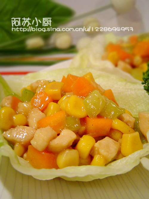 ![]() 材料:甜玉米(罐头),胡萝卜,黄瓜,鸡胸肉, 过程: 1、生菜洗净,轻轻的把叶子剥下来,用剪刀剪成小碗状,放盘中备用! 2、鸡胸肉切丁,用盐、料酒、淀粉、蛋青腌半小时;胡萝卜、黄瓜切小丁;3、锅中