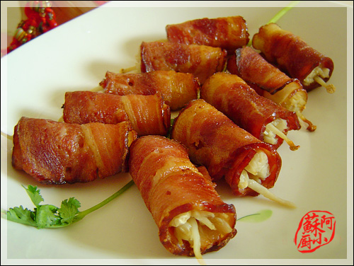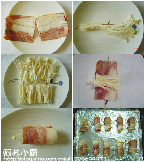 >2、将金针菇段放在培根上,取一根稍微长一点的放在中间,然后卷起,用牙签固定。