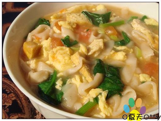 自家的手擀面加上酸酸的番茄鸡蛋卤汁还有菠菜