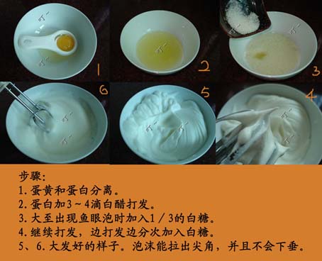 做法: (1)将白醋倒入蛋白中,并分次倒入细纱糖,用打蛋器打发。 (2)将蛋黄搅散,分次加入细纱糖,油和牛奶搅拌均匀。 (3)将面粉过筛。分次倒入(1)中搅拌均匀,不要画圈! (4)将打发的蛋白,分1/3倒入已经搅拌好的蛋黄面糊中,从底部向上翻着搅拌,切记不得画圈哦,否则一定会消泡的~~~~ (5)再盛1/3的蛋白,倒入面糊中搅拌。搅拌方法同上。 (6)将搅拌好的面糊,倒入剩余的1/3蛋白上,继续从底部向上翻着搅拌至均匀。 (7)倒入电饭锅中,抹平表面。 (8)加热30分钟即可! 读图ing.....