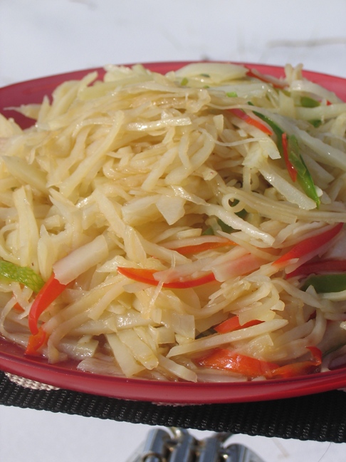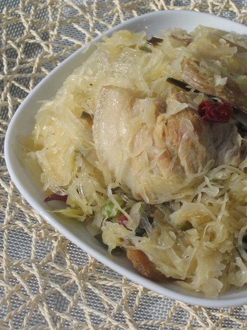 炒酸菜粉丝: 大蒜、干辣椒炒香,放入切片的五花肉炒2分钟,然后放入酸菜炒3分钟,加水放入粉丝炖3分钟即可。