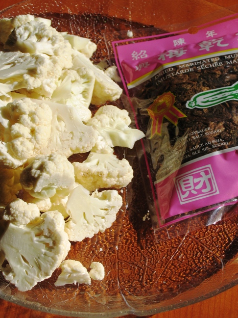 梅干菜花: 做法: 1. 梅干菜用水泡10分钟,攥干水分。 2. 炒香大蒜、干辣椒,放入梅干菜炒2分钟。 3. 放入菜花,加些水炒3分钟,加盐糖即可。