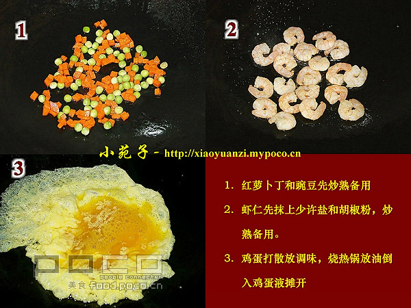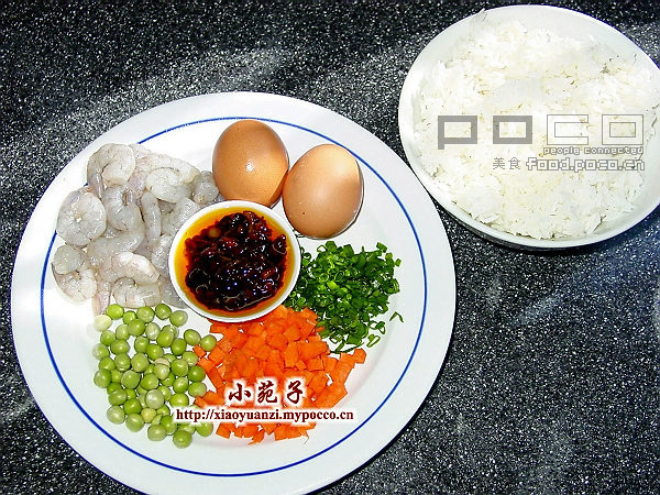 材料:冷饭2碗,鸡蛋2只,虾仁、豌豆、红萝卜丁和葱花各适量、XO酱2匙