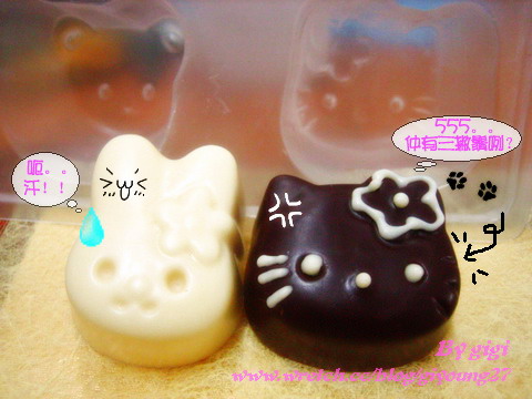 ![]() 朱古力有多就倒入朱古力模中做了只“Hello Kitty”和兔仔朱古力~~ —_—|||~~~呃~~Kitty右邊三撇胡鬚漏了畫~~汗~下次再幫你補回來啦~~ ![]()