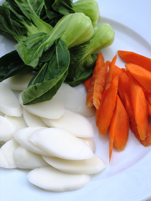 素炒年糕: 做法:年糕泡3个小时。大蒜炒香,放入年糕、小青菜、胡罗卜炒3分钟,加盐糖炒2分钟即可。我喜欢吃汤年糕,加了些水,还放个鸡蛋。