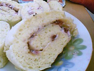 3.出炉后马上倒扣出模,放在凉架上,散热3、4分钟,蛋糕摸上去还有余温就可以卷了。 4.卷的时候垫张保鲜膜在外面,这样不容易裂开,还不会弄得满手都是。 大家看看成品图吧,我用电脑的摄像头拍的。