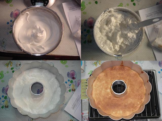 材料:蛋白258g,糖粉140g,低粉100g,盐1/2小匙,塔塔粉1小匙 呵呵~依个材料我自己调整既~因为我用剩甘多蛋白~原配方材料:蛋白120,糖粉50g,低粉45g,盐1/4小匙,塔塔粉1/2小匙 做法好简单:蛋白加塔塔粉加糖粉打至湿性发泡~面粉筛入拌匀~入模~180度烤25分钟~
