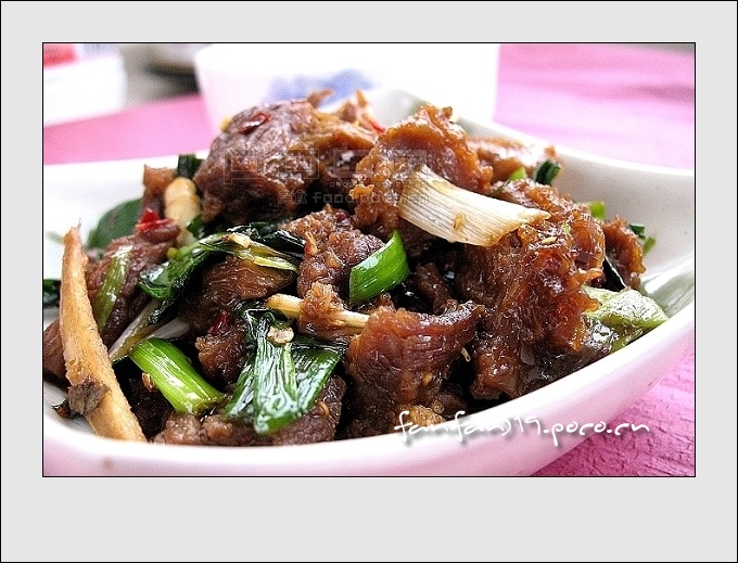 爆炒牛腩哈哈,天一冷就特别想吃肉呢,妈妈买回上好的牛腩,一半炖汤,一半爆炒,又香又辣,狠下飯滴说~~~~~~~~~~【材 料】 牛腩 500g 蔥段,蒜頭,高湯適量 【調味料】 醬油,白胡椒粉適量【做 法】 1.蔥、蒜入油鍋炸至金黃色香味溢出備用。 2.牛腩切段、汆燙去血水後洗淨備用。 3.熱鍋,放入作法(1)的蔥蒜、調味料炒香後,倒入高湯煮滾,再加入牛腩以小火煮20分鐘。