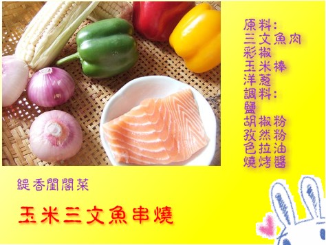 玉米又称包谷、包米棒子、玉蜀黍、玉茭、玉麦、珍珠米等。 大家都知道,生命源于海洋。鱼类尤其是深海鱼类如三文鱼,可以除皱养颜,降低血压,保护心脏、关节和胰岛,稳定血糖和情绪,增加智商,延年益寿。 配上维生素含量丰富的彩椒和洋葱,这串烧的营养和美味就都齐全了。