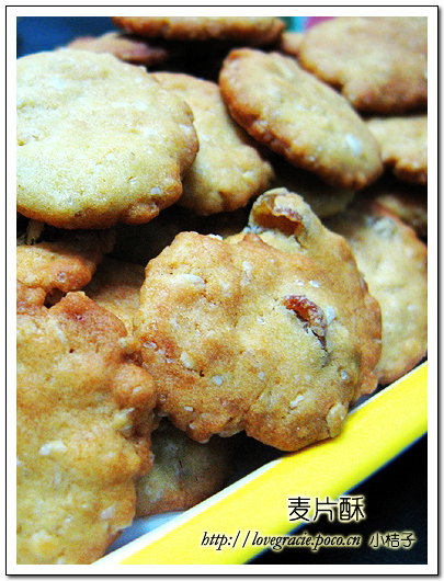 18号做的桃酥存活了8天,终于在26号也就是上周五晚被我消灭干净,为了能继续有零食磨牙,我终于动手了,这次是麦片酥,只是在桃酥的方子中多加了50g葡萄干(先用牛奶泡)和100g左右的麦片,面粉量相应减少一点点。 但也正因为加了葡萄干和麦片,成品的外型不规整了,bf说真没卖相啊,切~丑陋的外表下依旧有美好的内在哈!