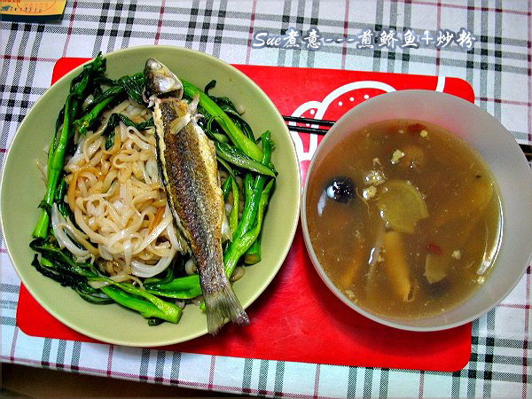 有之前喝剩的花胶汤,虽然煮了其他东西,饱肚便可。 菜市场有挺新鲜和大条的鲚鱼卖,我记得妈妈经常买来煎给我吃。不由得叫档主称了2条,18元/斤的价钱,2条已经要10元了。原来鲚鱼要这么贵的。 随便买了一点粉,做个炒粉作主食。 还烫了几条菜,维持纤维质的吸收。 煎得金*的鲫鱼,肉质奶白,味道鲜美,难怪要那么贵。