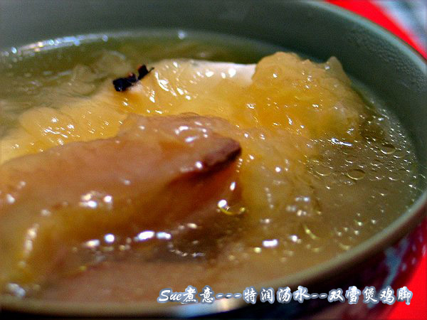 材料有:雪梨2个、雪耳适量、鸡脚8只、无花果适量、茨实适量、淮山2片、蜜枣一颗。 雪梨效用清润,雪耳和鸡脚的胶质非常丰富。这么冷的天喝汤,补充胶原蛋白的吸收。 步骤: