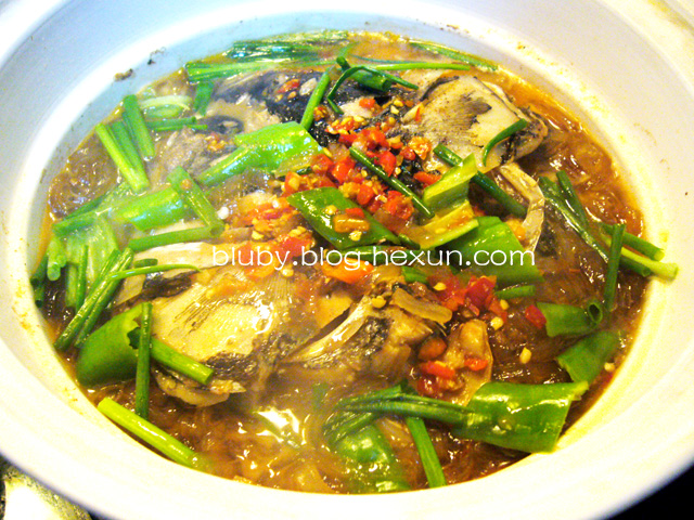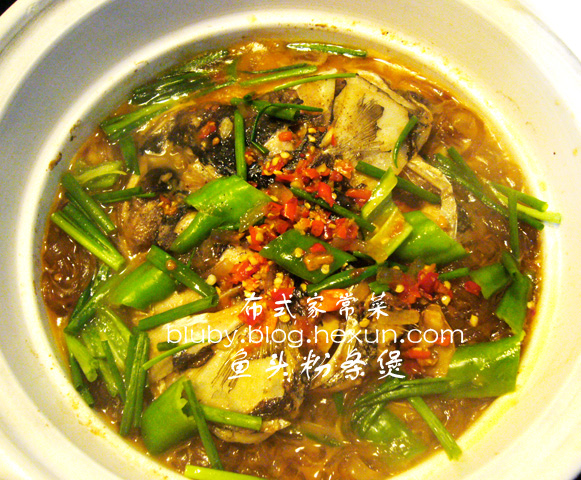 4,30-40分钟后,将葱段和青椒片,剁椒撒在表面,加盖继续焖煮5分钟即可。 注:有些粉条易熟,则需晚些加入,否则会使其碎烂。