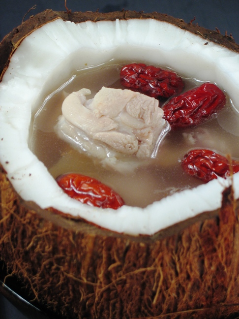 ![]() 2.椰子鸡汤 做法:新鲜椰子将汁倒出,放入鸡块(已用开水烫过),姜,红枣少许水蒸20分钟加盐即可。