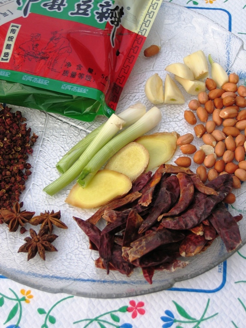 今天好友聚会,Susan 送了一只野兔(从专门的野物店买的).因此上豆芽就做麻辣兔丁,红烧猪蹄(朋友点名要吃),红油撇拉,香菇青菜,泡菜配绿豆粥. 1.麻辣兔丁: 做法: 1. 将兔肉切成小块,锅内放油炒至金黄. 2. 重新起锅,油热后,放干辣椒,花椒,葱姜蒜,郫县豆瓣,碎花生米炒香. 3. 放入兔肉炒3分钟即可.