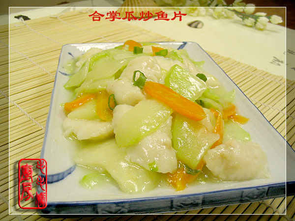 合掌瓜炒鱼片 用料: 1:冰冻龙利或金狮斑球鱼柳450克,洗净沥水切片(注意厚薄均匀),加1/3茶匙盐,1大匙生粉,白胡椒1/8茶匙拌匀腌20分钟。 2:合掌瓜一个250克,去皮洗净切片备用。 3:小胡萝卜5根50克,切片备用。 4:菜油3大匙,蒜蓉2茶匙,葱花1大匙。 5:水3大匙,绍酒1大匙,盐1/3茶匙,糖1/3茶匙。 6:生粉1茶匙加水2大匙拌匀,香油1茶匙。 做法:炒锅加菜油2大匙,置炉上开大中火,放入鱼片轻轻翻炒至八八成熟捞出。原锅加菜油1大匙,开大中火炒香蒜蓉和葱花,倒入胡萝卜片煸炒几下后加水3大匙继续炒至胡萝卜片断生汁干。接着到入合掌瓜片翻炒1分钟,接着倒入鱼片和所有剩余的5料,轻轻翻炒几下后,淋下6料兜匀至合掌瓜断生出锅。 ![]() 鱼肉嫩滑,合掌