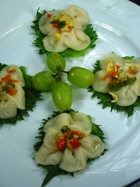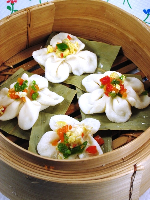 将5个角捏在一起,然后将反面的边翻起来蒸8分钟即可.