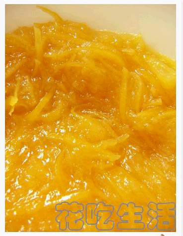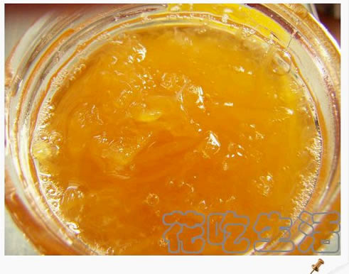 冷却后加入蜂蜜拌匀,喜欢吃果肉多点的,就少加一点蜂蜜,两个胡柚加300-400g的蜂蜜就可以了,选择槐花蜜比较好,颜色和口感都很配合。拌匀后倒入密封瓶子里,放入冰箱。(平时我从超市买的柚子茶放在外面没有坏过,可能是里面有防腐剂的原因,但是自制的柚子茶要注意,一定要放入冰箱冷藏,以免变质。)