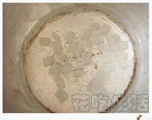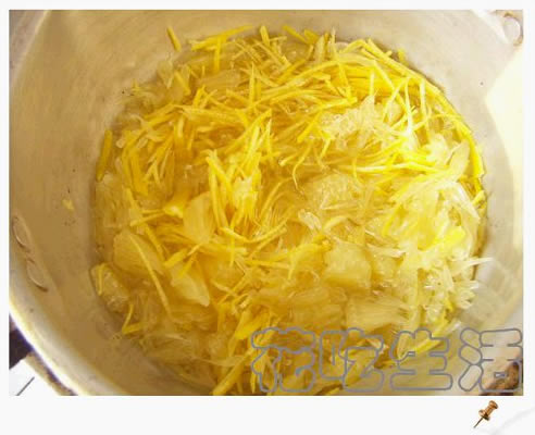 冰糖全部溶化,煮沸后加入果肉和果皮,中小火炖。(最好是先炖皮,后加果肉,因为皮比较不容易炖烂)