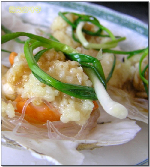 8、入锅蒸10分钟后关火。 9、每一个扇贝上淋上一茶匙酱油(酱油里最好放一点味精),把切好的葱丝堆放到贝肉上。 10、油锅中倒入少许油,加热,快速浇到每一个扇贝上。(可以加点蒜末一起爆热)。