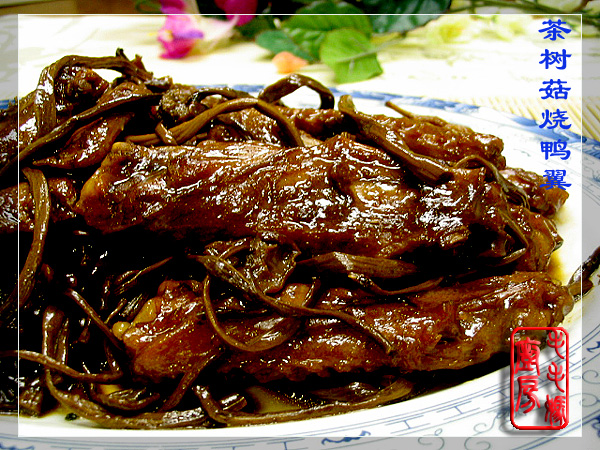 最近的几个家常菜。茶树菇烧鸭翼看到师爷做的茶树菇烧鸡馋得很,正好家里有干的茶树菇,照葫芦画瓢,用它烧了鸭翅膀,好吃。用料: 1:鸭翅膀530克,洗净沥水备用 2干茶树菇两把,水泡软切去根部,洗净沥水备用。 3:料酒1大匙,生抽酱油2大匙(万字牌酱油),金澜老抽酱油2大匙,糖1茶匙,盐1/4茶匙,水1杯。 4:葱1根切段,姜切片五片。 5:菜油1大匙。做法:炒锅内放1大匙菜油置炉上,开大火,放入葱段,姜切和鸭翅膀翻炒1分钟,接着放入茶树菇同炒1分钟。喷入绍酒放下所有的3料煮滚,调小火煮35分钟。然后捞出茶树菇装盘,再开大火收干汁,盛出鸭翅膀即可。