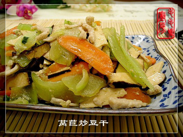 ![]() 莴苣炒豆干 用料: 1:莴苣250克,去皮洗净切片备用 2:五香豆干125克,洗净切片备用。 3:胡萝卜100克,去皮洗净切片备用 4:猪里脊肉75克,洗净切丝加盐1/8茶匙,2茶匙生粉,水1大匙,拌匀静置半小时。 5:盐3/4茶匙,水3大匙,鸡精1/4 茶匙。 6:菜油3大匙,葱花1大匙,蒜蓉2茶匙。 做法:炒锅内放2大匙菜油置炉上,开大中火,加肉丝翻炒至8成熟捞出。原炒锅放入菜油1大匙置炉上开大中火,放入葱花和蒜蓉炒香加胡萝卜片和豆干翻炒半分钟,喷入水3大匙接着翻炒2分钟。接着放入莴苣片和剩余的4料炒至莴苣片断生,拌入炒好的肉丝,兜兜匀出锅。 ![]()