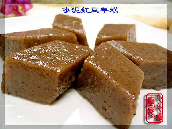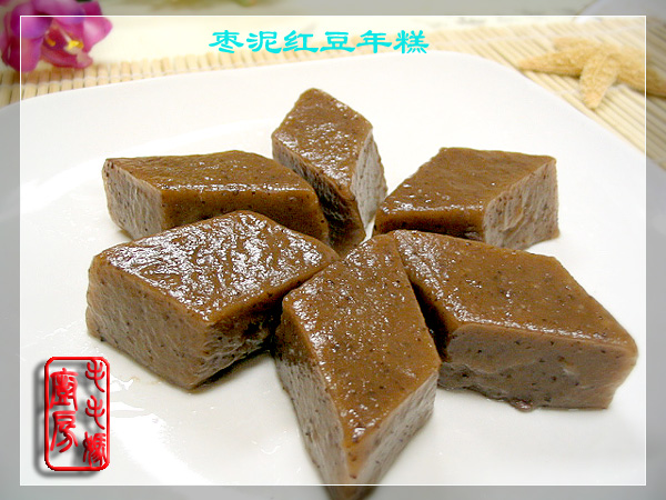 取一盆放入豆沙1.5杯,枣泥馅1杯和所有的2料,搅拌拌匀成糊。倒入直径22厘米的涂了少许菜油的玻璃烤盘中(图D)。上笼大火蒸40分钟,凉至室温后盖上保鲜纸冰箱冷藏几小时,刀上案板上图点熟菜油切块食用。