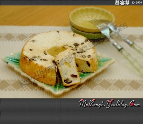 天使蛋糕是蛋糕里最简单的一种,只要一个盆子就可以了。 材料:蛋白四个、塔塔粉1/2茶匙、盐1/8茶匙、低粉50克、糖50克、葡萄干适量 1、 蛋白加塔塔粉打发。筛入面粉和盐,以及葡萄干。 2、烤箱预热160度,20分钟即可。 因为太简单,脱模前才想起来一张,今天用的是中空脱底模,形状没有不脱底的好看,可是方便。