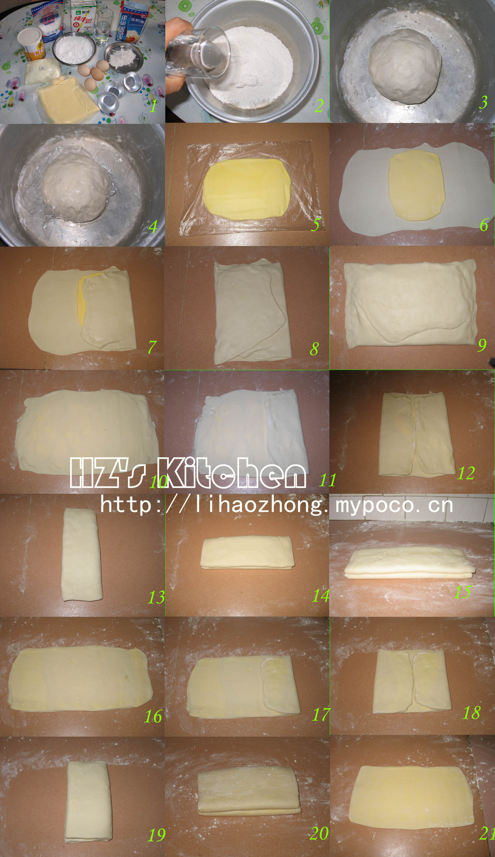 8.把三折好的面片再擀开,擀成厚度为0.6CM、宽度为20CM、长度为35-40CM的面片。用壁纸刀切掉多余的边缘进行整型。 9.将面片从较长的这一边开始卷起来。 10.将卷好的面卷包上保鲜膜,放在冰箱里冷蔵30分钟,进行松弛。 11.松弛好的面卷用刀切成厚度1.5CM左右的片。 12.将(11)放在面粉中沾一下,然后沾有面粉的一面朝上,放在未涂油的塔模里。用手将其捏成塔模形状。 13.在捏好的塔皮里装上蛋塔水(装七八分满即可,不能太满,不然会溢出),放入烤箱烘烤。烘烤温度为220摄氏度左右,烤约十五分钟。(我的时间长一点哦,温度也低一点200C,30分钟吧) ![]()