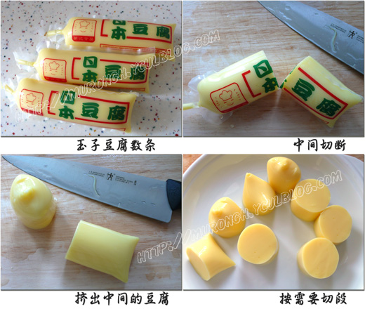 做法: 1、玉子豆腐切块,好像好多人都说不好拿出来,按照豆腐反面的切割线一刀下去,豆腐马上就出来了; 2、切块的玉子豆腐沾上生粉、滚满蛋黄液、再沾上柴鱼片; 3、小火烧热油锅,炸透豆腐; 准备醮料 材料:酱油、柴鱼片、糖、盐、姜 做法:锅里放少许水煮开后放入所有材料后略煮,过滤即可。 ![]() |