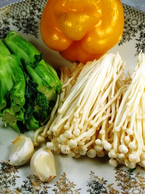 做法:金针菇和绿菜花茎部用开水烫一下,将绿菜花茎部和黄辣椒切成丝,然后放入盐糖,香油,辣油拌匀即可。
