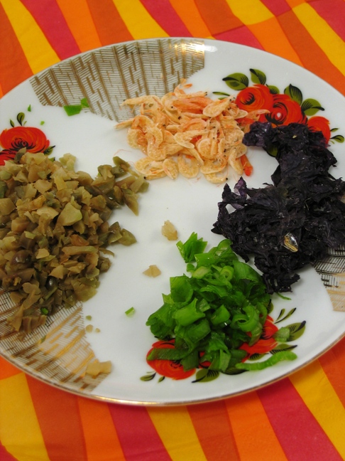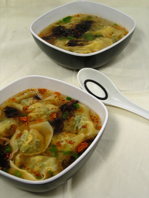 放在馄饨皮里,包成元宝馄饨 具体图解见http://blog.westca.com/blog_anjing319/p/86755.html ![]() 汤料: 温开水加入切好的榨菜,葱丝, 以及虾皮, 海苔,辣油,香油.