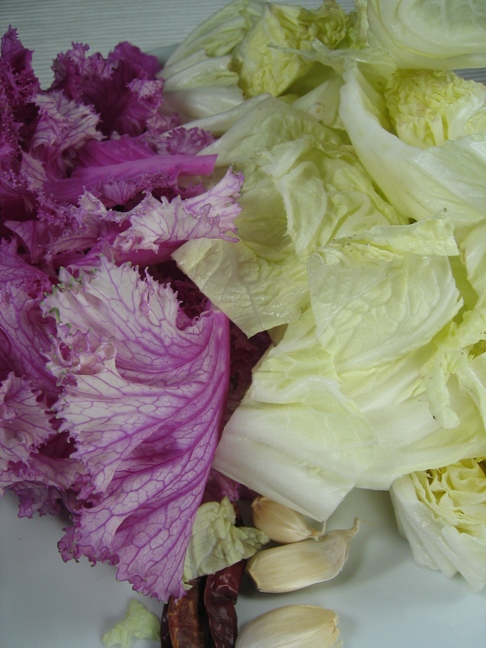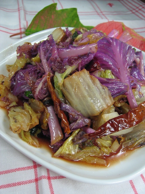 做法:大蒜炒香,放入紫色菜和大白菜炒3分钟,加醋,盐糖即可。