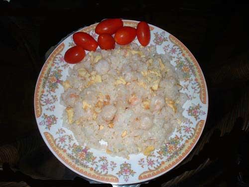 特点: 爽口开胃,是很好的开胃菜。 QUOTE: ![]() 虾仁炒饭 主料:鸡蛋(一个)、虾仁(100g)、米饭(150g) 成本:4.00元 调料: 精制油、盐 做法: 1. 将虾仁上浆(生粉/面粉=1:1),加盐少许, 2. 热锅下油,(双排小火)二成热放入虾仁滑炒,至变色,起锅待用; 3. 热锅热油,放入鸡蛋液边炒边划碎,成型后放入米饭、虾仁,撒入盐少许翻炒即可。 QUOTE: