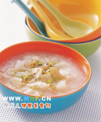 续煮5分钟,加白砂糖煮溶即成。 特色: 帮助排除宿便,轻盈体态又不失营养。 ![]() 28:山药萝卜粥 原料: 白米 1杯 山药 300克 白萝卜 1/2个 芹菜末 少许 水 10杯 辅料: 盐、胡椒粉、香菜……各适量 做法: 1.白米洗净沥干、山药和白萝卜均去皮洗净切小块。 2.锅中加水10杯煮开,放入白米、山药、白萝卜稍微搅拌,至再次滚沸时,改中小火熬 煮30分钟。 3.加盐拌匀,食用前撒上胡椒粉、芹菜末及香菜即成。 Tips: 山药近年被视为滋阴补阳圣品,对于女性丰胸、肌肤防皱有效果。萝卜则有排水利尿、 帮助消化、避免脂肪堆积等功效,两者搭配食用,对于女性美容养颜、瘦身消肿均有奇 效。 特色: 恢复体力,调节气血,帮助减脂瘦身。