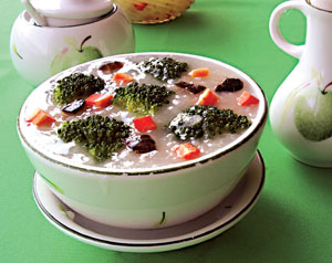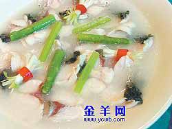 3.火候:先用大火煮开,再转文火即小火熬煮约20-30分钟,这样粥的香味就更浓。 4.搅拌:搅拌可以让米粒颗颗饱满、粒粒酥稠。搅拌的技巧是:开水下锅时搅几下, 盖上锅盖至文火熬20分钟时,开始不停地搅动,一直持续约10分钟,到呈酥稠状出锅为 止。 5.点油:粥改用温火煮约10分钟滴入少许色拉油,你会发现不光成品粥色泽鲜亮,而 且入口别样鲜滑。 6.底、料分煮:这样熬出的粥品清爽不混浊,每样东西的味道都熬出来了又不串味。 特别是辅料为肉类及海鲜时,更应粥底和辅料分开。 ![]() 17:粥水浸大鱼片 用粥水煮过的鱼片更加鲜甜,翠绿的芦笋和挑花芹菜的点缀更让人眼前一亮。 主材料:粥水、大鱼片、芦笋、芹菜 制法:将切好的鱼片、芦笋、芹菜一起放入粥水中煮至微滚即可。 要点:这道菜的做法简单,关键在于用料。 选择鱼片时,大鱼或鲩鱼的鱼片都合适,大鱼片的味道更加鲜美,鲩鱼片的质感特 别好,两者各有千秋,食家可根据自己的喜好选择。取鱼片时,鱼脊的部分肉质、口感 最好。 芦笋、芹菜在这道菜中的作用行家称之为“料头”,可以增加汤的鲜味和香味,吊 出肉的鲜味的同时辟除肉腥及其他异味,在上碟时还可以起到“画龙点睛”的点缀作用 。 ![]() 18:粥水螺片煮丝瓜软 嫩绿的丝瓜软清甜软滑,海螺片爽口鲜甜,加上清新的米香,清淡的口味、简单清 新的颜色搭配最适合用来驱散了夏天的炎热和烦躁。 主材料:粥水、大连海螺肉、丝瓜软 制法: 1、丝瓜去皮、去囊,取中间的丝瓜软部分备用。 2、海螺肉切片,用滚水灼过备用。 3、将丝瓜软和灼好的螺片放入粥水中同煮,微滚时稍作调味即可上菜。 要点: 螺肉要求味鲜爽口,大连海螺肉以其肉质爽口、味道鲜甜成为首选,只是这种海螺 肉市面上较难买到。 用粥水煮海螺片时要注意控制时间,微滚即可,否则海螺肉