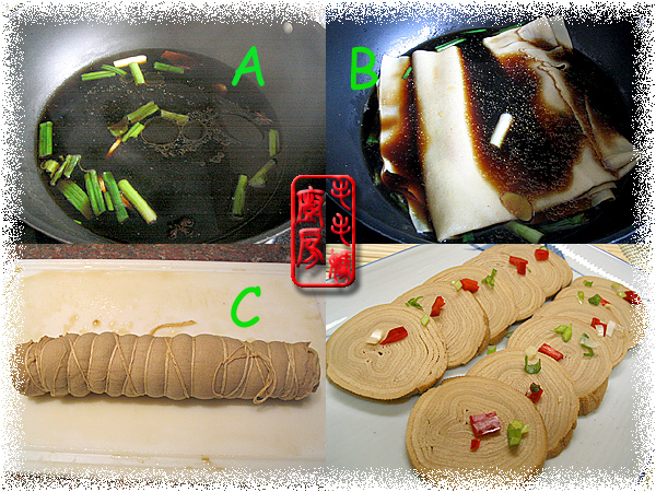 借此贴多谢厨友们对偶的支持和鼓励~~ 圣诞大餐秀(菜1)----百叶素卷 用料: 1:千张(百叶,豆腐皮)一袋300克,洗净沥水切两大段。 2:水3杯,葱1条切段,姜片5片,八角2粒,桂皮一小块,绍酒2大匙,万字牌生抽酱油1/4杯,金兰老抽酱油1/4杯,糖1/4杯,盐3茶匙,香油2大匙,鸡精1/2茶匙。 3:纱布,棉线适量。 做法:炒锅加入所有的2料(图A),开大火煮滚,放入两大片的千张再滚,调小火煮5分钟离火(图B)。让千张在汁中泡2小时,捞出沥干汁,将一块千张放案板上,从下往上卷紧成筒,然后再把剩下的一张再卷上,接着用纱布将千张卷裹紧,用线绑紧(图C)。