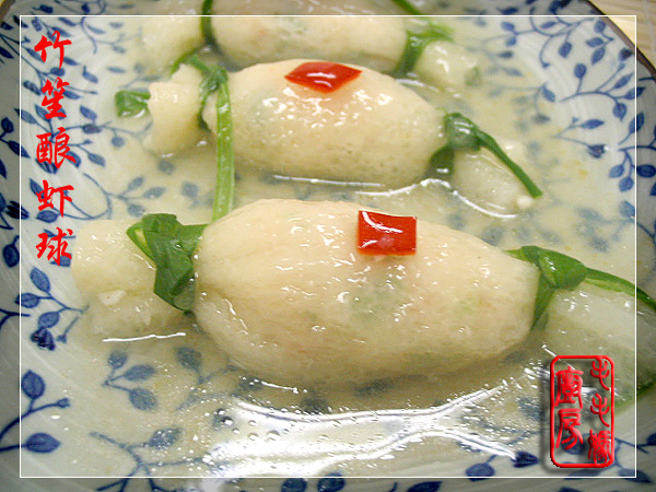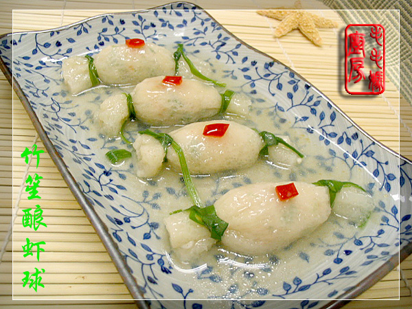 虾味鲜美,竹笙清爽,外观漂亮,是宴客的好菜。 用料: 1:整条完好干竹笙15条,水泡软,洗净每条切去头尾备用。 2:虾100克,去壳洗净切小粒。 3:猪里脊肉75克,洗净切小粒。 4:盐1/3茶匙,白胡椒1/8茶匙,生粉1大匙,葱花1.5大匙,鸡精1/4茶匙,绍酒2茶匙,水1大匙,糖1/3茶匙。 5:水1/3杯,盐1/3茶匙,鸡精1/4茶匙。 6:生粉1茶匙加水2大匙拌匀,香油2茶匙。 7:葱一根,洗净切长系丝,开水中烫软备用。红辣椒丁2茶匙 做法:取一碗,放入2,3和 4料拌匀。用一双筷子顺一个方向搅拌至馅上劲。小心将1茶匙的虾肉蓉塞入竹笙段中,两头用葱丝打结。将做好的竹笙酿虾球坯放入炒锅里,加入所有的5料,置炉上开大火煮滚,调小火煮1-2分钟后,捞出竹笙酿虾球装盘。原汁留锅里,调中火,倒入所有的6料拌匀煮滚成薄芡汁,淋到竹笙酿虾球上即可。 ![]() 非常好吃。 ![]() 做的时候费点事,值。