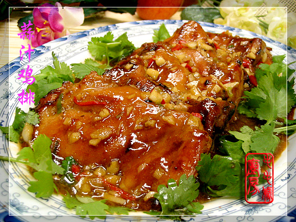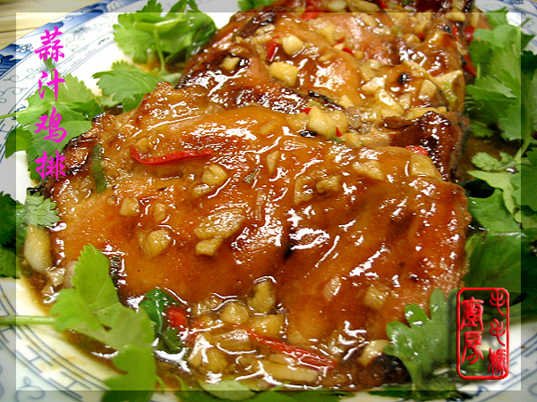 圣诞大餐秀(菜6)----蒜汁鸡排 圣诞节不吃火鸡也要有个鸡的菜,日前在Costco 买了一大盒的去皮去骨的鸡腿肉,就拿它来整治了。 用料: 1:去皮去骨的鸡腿肉7片450克,洗净沥水备用。 2:绍酒1大匙,万字牌生抽酱油3大匙,金兰老抽酱油1大匙,糖2茶匙,水2大匙。 3:生粉1茶匙加水3大匙拌匀。 4:橄榄油3大匙,蒜蓉1.5大匙,小红辣椒粒2茶匙。 做法:将沥水的鸡腿肉依次每块装入塑料袋里(防止喷溅),用专门槌肉的槌子敲松。然后将槌松的鸡排加2拌匀腌20分钟。煎锅加橄榄油3大匙,置炉上开大中火,放入腌好的鸡排煎至两面焦香捞出摆盘。原锅加蒜蓉和红辣椒粒炒香,放下剩余的腌鸡的汁和3大匙水煮滚,接着淋下生粉汁(3料)兜匀成芡汁,淋到鸡排上即可。 ![]() 非常好吃。 ![]() 圣诞大餐秀(甜品)----巧克力乳酪蛋糕 用了Jean Paré的方子,稍微改动了下,用了菜油代替牛油。觉得乳酪馅部分比较
