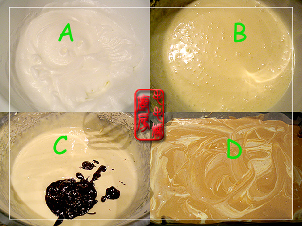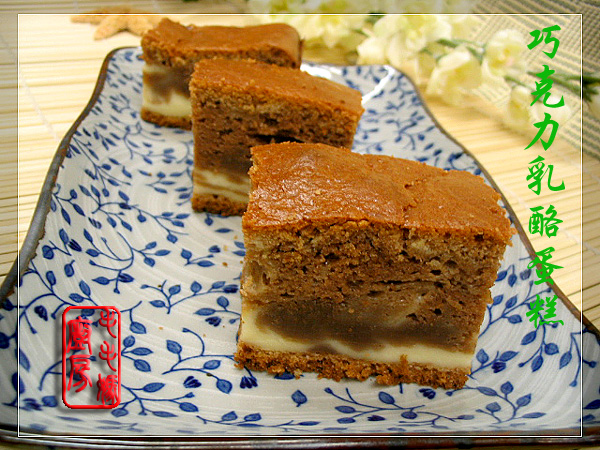 用料:乳酪馅: 1:原味乳酪 (CRAFT Philadelphia, cream cheese) 250克,在室温静置软化。 2:鸡蛋两只, 糖1/2杯,玉米粉(Corn starch)1大匙,香草香精(Vanilla extract)1/2茶匙。蛋糕: 3:鸡蛋5个,塔塔粉(Cream of tartar)1/4茶匙或白醋1茶匙。 4:玉米油1/2杯,糖1 1/4杯,香草香精(Vanilla extract)1茶匙,牛奶1 1/4杯。 5:中筋面粉1 3/4杯,嫌费事没过筛 (All purpose flour) 加1茶匙泡打粉(Baking Powder),和1/2茶匙小苏打(Baking soda)拌匀。 6:半甜巧克力丁1/3杯,加牛奶2大匙微波炉热溶化(1分钟)拌匀。 做法:乳酪馅:取一盆放入原味乳酪,用搅拌器高速打2分钟,然后加入一个鸡蛋高速打2分钟。接着放入另一个鸡蛋高速打2分钟后加玉米粉和香草香精打匀备用(图B)。蛋糕:取一盆放入5个蛋白和白醋1茶匙,用搅拌器高速打几分钟到发,翻转盆蛋白不流出(图A)。另取一盆放入5个蛋黄和所有的4和5料,用打蛋白的搅拌器高速打5分钟,接着倒入熔化的巧克力再高速打2分钟(图C)。然后将蛋黄面糊分四次放入先前打发的蛋白里,用橡皮刀从上往下轻轻拌匀(Folding Motion)。然后将一半的蛋糕糊倒入铺了烤盘纸的22x33厘米的烤盘里,中间到入乳酪馅抹平后,再到入剩下的蛋糕糊抹平(图D)。 ![]() 将烤盘放入预热至350F/160oC的烤箱内,烤50-60分钟,牙签叉入蛋糕,取出不沾就烤好了。冷凉后脱模,撕去烤盘纸,切块食用。 ![]() 近