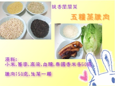 杂粮大都口感比较粗糙,所以在做的时候要注意处理和搭配,否则营养是全面了,可是大家也不爱吃。 我做的这个五粮蒸腊肉就是用五种粮食,配合腊肉一起蒸出来。腊肉选的是五花的,油分比较多,蒸过之后油分就会被五粮吸收,这样本来口感粗糙的杂粮就会增添不少风味,蒸之前的炒制也非常重要。炒的时候油也要多放一点,注意调料不要放的太多,因为腊肉是咸的。 五种粮食在泡的时候最好分开泡,小米和香米可以少泡一会,个头大的就要多泡些时间了。泡不透的话蒸的时候不容易蒸透。
