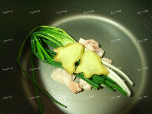 3.鸡腌制好以后,沥干汁水备用。在电饭锅底层铺上肥膘,再放一层葱姜;