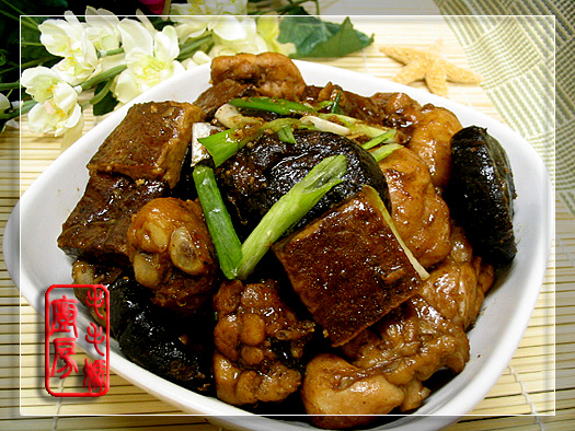用料: 1:鸡腿700克,洗净切小块沥水备用。 2:香菇7朵,用水泡软,洗净切细粒。 3:五香豆干125g,洗净切小块备用 4:橄榄油1大匙,葱2根切段,姜切片3片。 5:绍酒1大匙,盐1/4茶匙,糖2茶匙,万字牌生抽酱油2大匙,金兰老抽2大匙,八角一粒,水1杯。 6:橄榄油1大匙,香油2茶匙。 做法:大炒锅内放橄榄油1大匙置炉上,开大中火,放入鸡块炒香后加入一半的葱和姜片炒香。接着加入5料煮滚,然后倒入香菇和豆干块,调小火煮40分钟,间中翻一翻。开中火收汁后,加葱花和香油兜匀出锅。